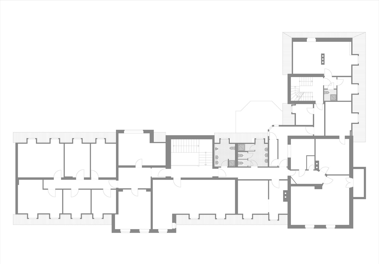 Zudem befinden sich in beiden Geschossen des Seitenflügels jeweils ein Raum mit Toilette, Dusche und Waschbecken, wobei der im Erdgeschoß so gestaltet ist, dass er auch für Behinderte geeignet ist.